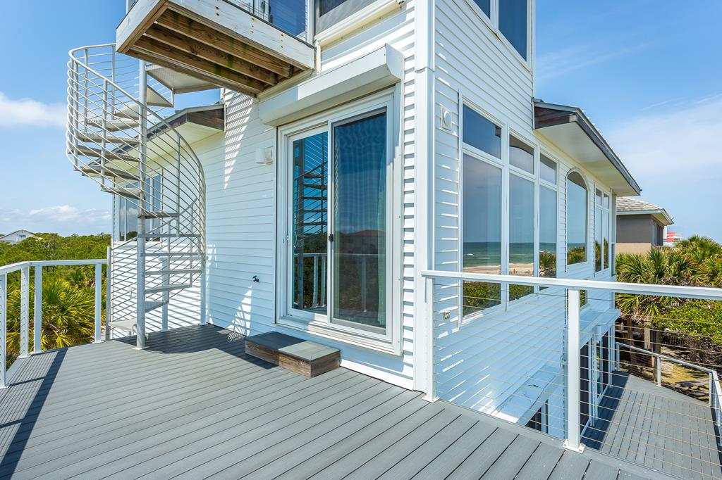 STUNNING PANORAMIC VIEWS from this Gulf front custom home located within The Plantation on St. George Island, Florida. This home features walls of windows, 8” crown moulding with 5” baseboards, a unique gas fireplace and beautifully refinished hardwood floors. Built in 1993, this beloved beach home has never been rented. Entry to this home starts on the second level where you are greeted by a grand staircase that beckons you to go higher to the uninterrupted 180 degree views. A central sitting area divides the primary en suite from the other two bedrooms. Each bedroom offers a set of beach facing sliding glass doors that open onto a Trex deck leading to the outdoor screen porch and stairs down to the lower pool deck and beach boardwalk. Primary bedroom features a walk in closet, en suite bath w/jetted garden tub and separate shower. Continuing up the 50” wide staircase to the third level, you will encounter the breathtaking and unobstructed views of the beach from all angles of the great room. Spacious kitchen offers plenty of storage, two sinks, and large island for cooking and entertaining. French doors open to a deck with outdoor elevator servicing all three levels. Sliding glass doors on the opposite corner open to another deck w/spiral staircase taking you up to the bonus room. This climate controlled room literally “towers” above the beach; a haven for sunrise coffee or afternoon reading. The ground level offers a self-contained, tiled, handicap-friendly suite with separate bedroom, full bath w/walk-in shower, and a custom kitchenette complete with all appliances. Sliding doors open directly to extra large pool area. This level includes plenty of inside storage, laundry area with a full-size stackable washer and dryer, water softener w/RO filter system, two enclosed garages, w/outside hot/cold shower, and hot/cold fish cleaning station. New buyer fee 0.5% to HOA. This home is ready to move into as your personal residence or income producing property!