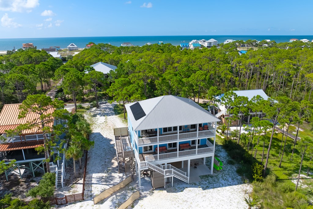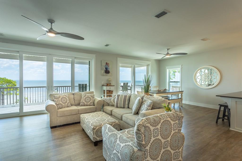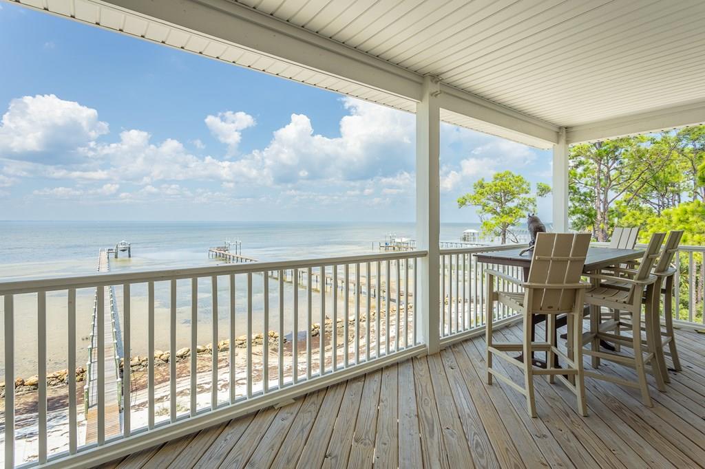 Welcome to your private coastal retreat—this custom-built bayfront home is a showcase of quality craftsmanship, thoughtful design, and sustainable living. Meticulously maintained and never rented, this residence offers a peaceful sanctuary with stunning bay views and first-class amenities. Step inside to an open-concept layout featuring inviting color palette and low-maintenance COREtec flooring. The chef's kitchen is outfitted with quartz countertops, stainless GE Profile appliances, and a smart, stylish flow perfect for entertaining. Spa-like tiled bathrooms, walk-in showers, and 9' ceilings elevate the comfort throughout. Walls of 7' tall impact-rated windows and glass doors frame breathtaking bayfront vistas. The entire home is energy self-sufficient, thanks to a battery backup solar system that contributes to very low monthly electric costs. Enjoy over 345' of private dock with rope-trimmed railings leading to your 10,000 pound capacity boat lift, with 12,000 pound capacity, 8' wide straps. The dock is also wired for power and plumbed for water. Shoreline riprap extends beyond the lot lines, providing extra erosion protection with a small break in the rocks to launch your kayaks or paddle boards. Catch fish or crab from the dock, rinse off in the enclosed outdoor shower, and relax on expansive covered decks on both the 2nd and 3rd floors. Practical touches include an elevator to all floors, under-house parking and entertainment space (14' x 30'), easy-access platforms via full set of stairs for the solar system and HVAC, and low-maintenance landscaping. This is more than just a home—it's a testament to quality, sustainability, and the bayfront lifestyle.